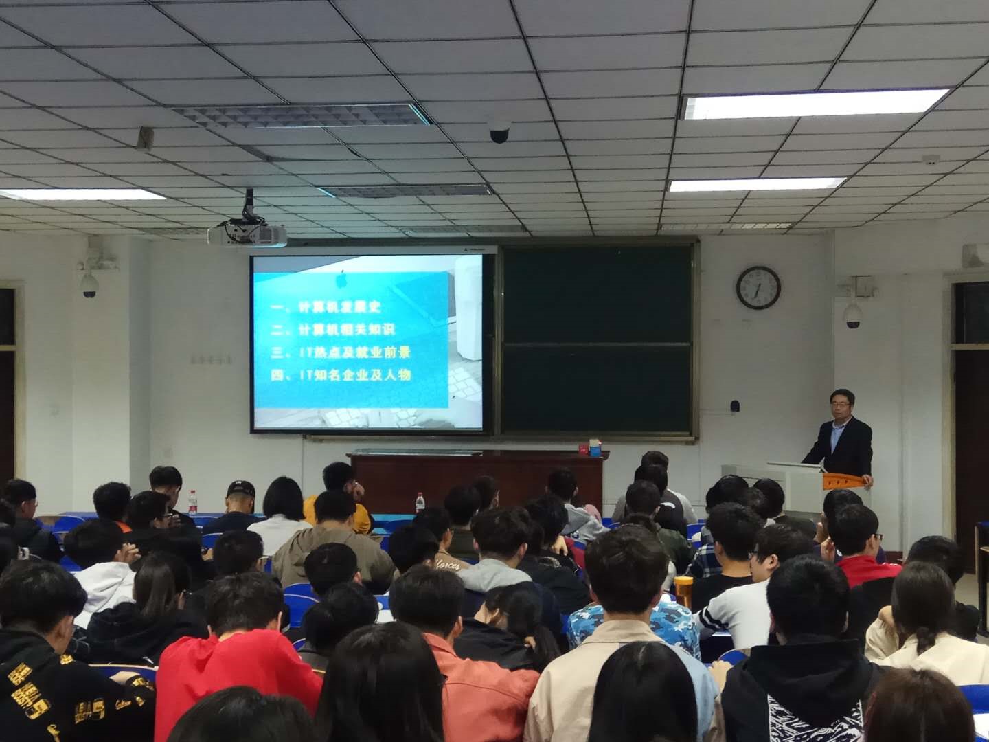 讲座开始,刘院长分享了自己与计算机专业的深厚渊源,他谈到在大学毕业后的35年里从未离开过计算机专业。接下来,刘院长从计算机的发展史、计算机的相关知识、IT热点及就业前景、IT知名企业及人物四个模块进行了讲解。从最早的电子管计算机到超大规模集成电路计算机,从“只有0和1最简单专业”到“人工智能”、“大数据”的IT热点方向,整场讲座案例丰富,深入浅出。讲座尾声,刘院长又以讲故事的方式让同学们了解了许多IT大佬,如比尔盖茨、乔布斯、马化腾、史玉柱等,同时讲述了这些大佬的创业历程,让同学们更加了解微软、英特尔、腾讯、百度、阿里等世界知名企业,鼓励大家就业目标瞄准这些企业。