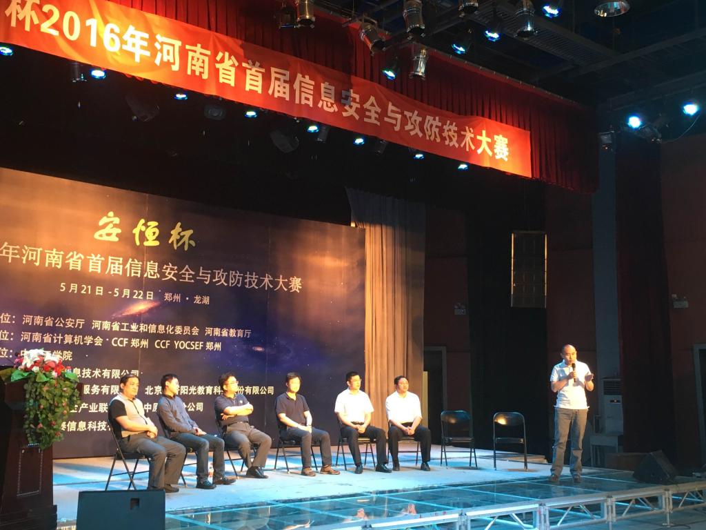 5月21日上午,河南省首届信息安全与攻防技术大赛在bv1946伟德龙湖校区开幕。主办单位bv1946伟德党委副书记郭正让代表学校致辞,解放军信息工程大学博士生导师罗兴国、河南省公安厅网监总队副总队长王志奇、郑州大学信息工程学院院长周清雷、河南省工业和信息化委员会网络安全处处长李建华、河南省教育厅科技处副主任麦世奎、CCF YOCSEF郑州主席单征等出席了大赛开幕式。信息工程大学罗兴国教授和杭州安恒信息安全技术有限公司袁明坤副总裁分别在大会上做“拟态防御技术”和“国内外最新网络攻击回顾”。本次大会有我院院长郑秋生主持。