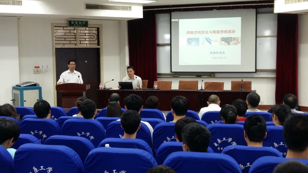 2015年5月17日下午,在南校区4号楼311学术报告厅,信息工程大学四院博士生导师郭渊博教授,做了题为“网络空间安全与高级持续威胁”的学术讲座,刘卫光副院长主持此次讲座,1946伟德国际网络安全方向组老师、全体研究生和网络工程专业本科生聆听了此讲座。