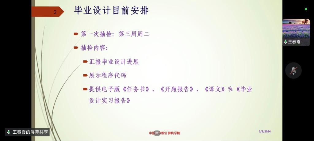 3月5日,1946伟德国际、人工智能学院在4号教学楼441教室和线上会议同步开展了毕业设计过程指导专题讲座,学院邀请计算机科学与技术专业副主任王春霞主讲,部分指导老师及2024届全体毕业生参加讲座。