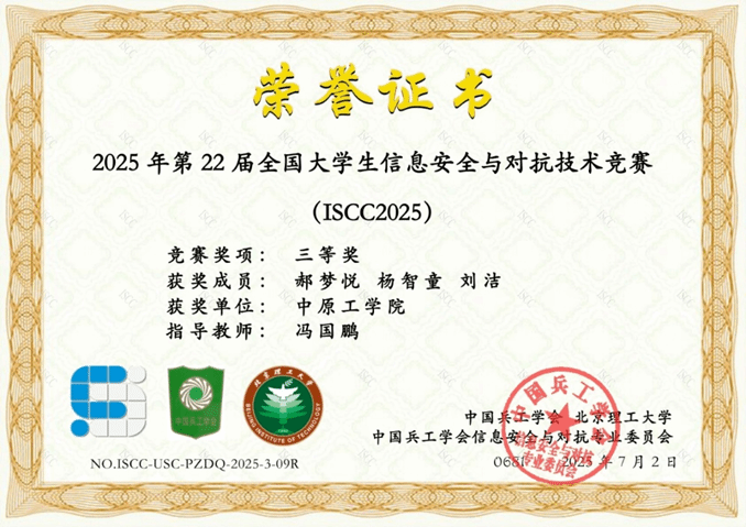 近日,2025年第22届全国大学生信息安全与对抗技术竞赛(ISCC)总决赛获奖名单正式公布。1946伟德国际DROPS攻防训练营选派的参赛队伍表现优异,共斩获全国一等奖1项、三等奖4项。其中,由汤克宇(计科221)、段留鹏(计科232)、吕可贵(信息232)组成的“凌晨两点半”代表队凭借出色的攻防实战能力,荣获全国一等奖。