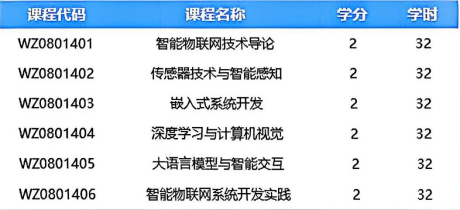 培养目标:面向国家新一代信息技术战略与行业数字化转型需求,以 “厚基础、重实践” 为指导,培养掌握智能物联网基础知识与核心技术,具备扎实物联网基础、AI 算法应用能力及跨学科思维,可从事相关科研、开发、设计的高素质复合人才。