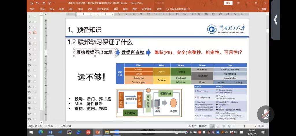 李老师首先从预备知识、设计初衷、研究内容、创新性等方面,分享了在IEEE TPAMI期刊上的最新研究成果“多阶段差分隐私保护的异步联邦学习效用优化”,介绍了联邦学习与差分隐私的融合,以及如何应对设备异构性的挑战,利用多阶段自适应私有算法,改善DP增强异步联邦学习的模型效用和隐私之间的权衡,为私有AFL提供了一种分析方式,给师生带来很大的启发。