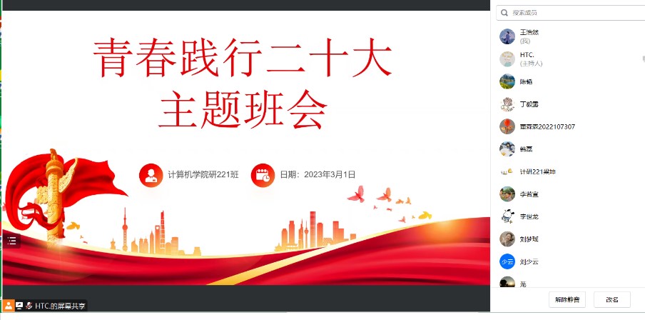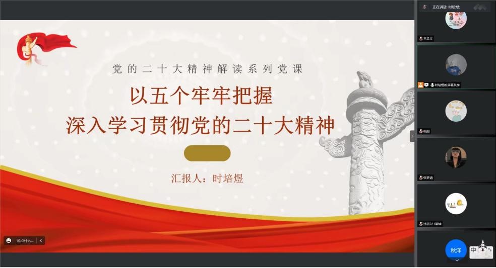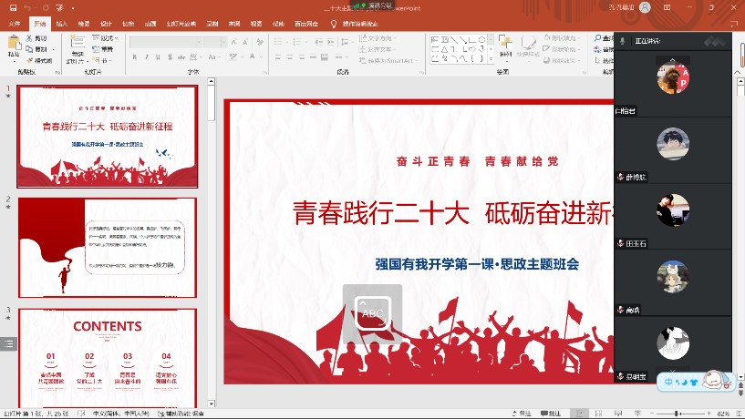 为学习宣传贯彻党的二十大精神,推动习近平新时代中国特色社会主义思想学习走深走实,根据上级要求,我院在全体本科、研究生班级中组织开展“青春践行二十大、砥砺奋进新征程”主题班会,激励全体学生自信自强、守正创新,踔厉奋发、勇毅前行,在新征程上奋勇争先、更加出彩。