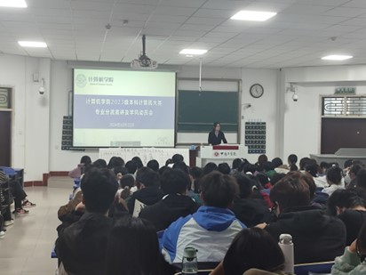 侯向花首先对高校大类招生、专业分流的意义进行解读,对我院自2018级开始的计算机大类分流情况进行详细介绍,希望2023级同学以专业分流为契机,积极探索个人发展,科学合理做好未来规划,坚定自己的初心选择,共同建设优良学风,在未来的学业道路上不断精进、全面发展,成为具有深厚家国情怀、广阔国际视野、扎实专业技能和创新能力的新时代高素质人才。