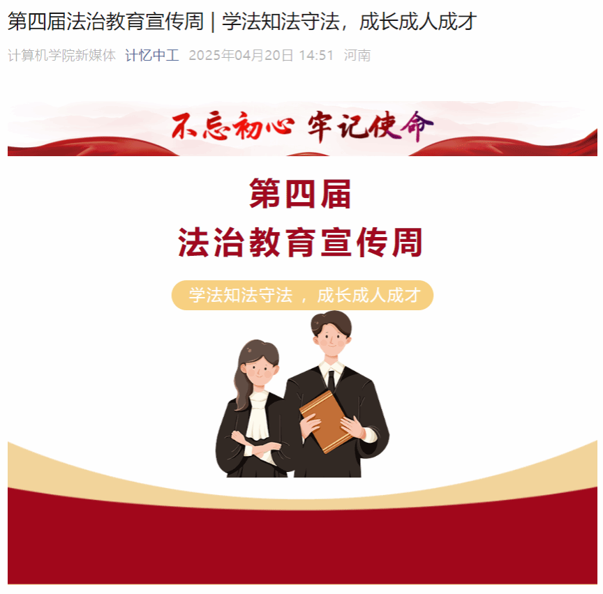4月20日,学院利用“计忆中工”微信公众号平台,发布了以“学法知法守法,成长成人成才”为主题的推文。推文通过图文并茂的形式,阐述了“法制教育的意义”,“法制建设原则”等内容,提升了学生的国家安全意识和法治素养。