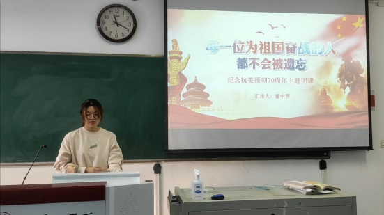 25日晚各团支部组织团员观看“致敬抗美援朝”主题云团课,之后,团支书对活动主题进行了简单的介绍,并就所观看内容以及时事发表了自己的感受。同学们也积极踊跃的参与到了分享感受的队列当中,发表了深刻的感言,认为通过此次主题团日活动获益良多。
