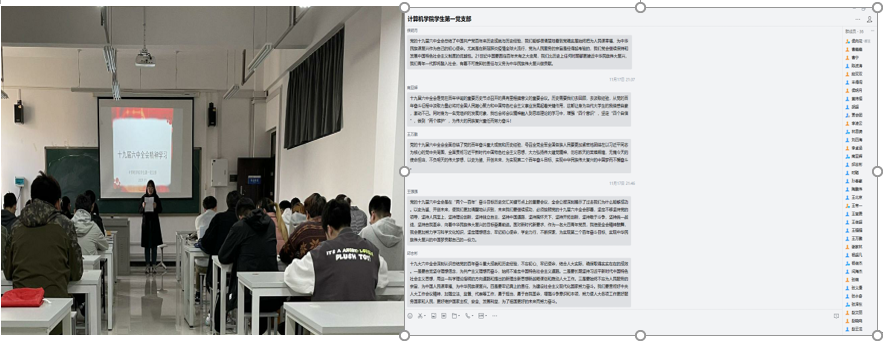 支部党员赵云龙、王帝一作为党员代表先后发言,十九届六中全会对党的发展历程进行了总结回顾,也对全体党员提出了要求和期望,作为新时代的学生,将继续深入学习党史,汲取前行的动力,扛起时代重任,让青春绽放绚丽之花。其他党员也通过网络平台进行了学习体会分享。