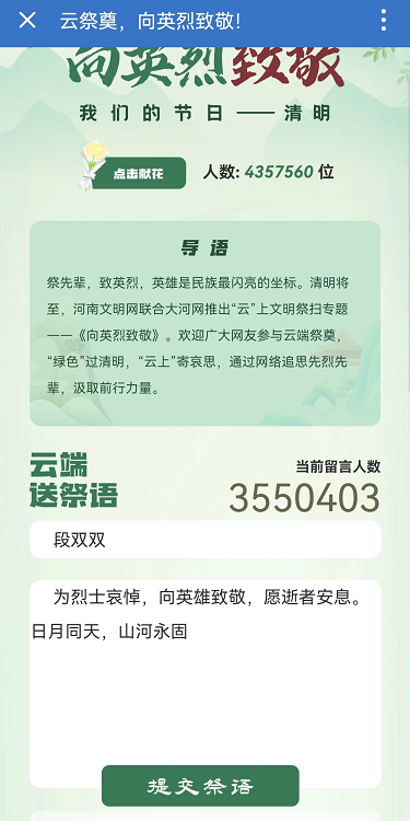 活动内容第三项:网上祭英烈,云端寄哀思。支部党员纷纷在由河南文明网主办的“云祭奠,向英烈致敬!”活动中,向英烈云端送祭语,表达哀思。响应号召,做到了绿色清明,低碳清明,文明清明。