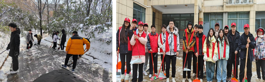 在除雪志愿服务活动中,身穿志愿者红马甲的我院党员、积极分子,不畏严寒、通力配合,有从学校借到的铁锹、有从宿舍带来的搓斗,有轮番上阵攻克坚冰的、有挥舞扫帚扫雪不停的,大家热火朝天开展一场劳动竞赛。经过接续奋战,3号组团北的主干道及我院分管清洁区的道路积雪清扫初见成效,打通了师生便利出行通道。